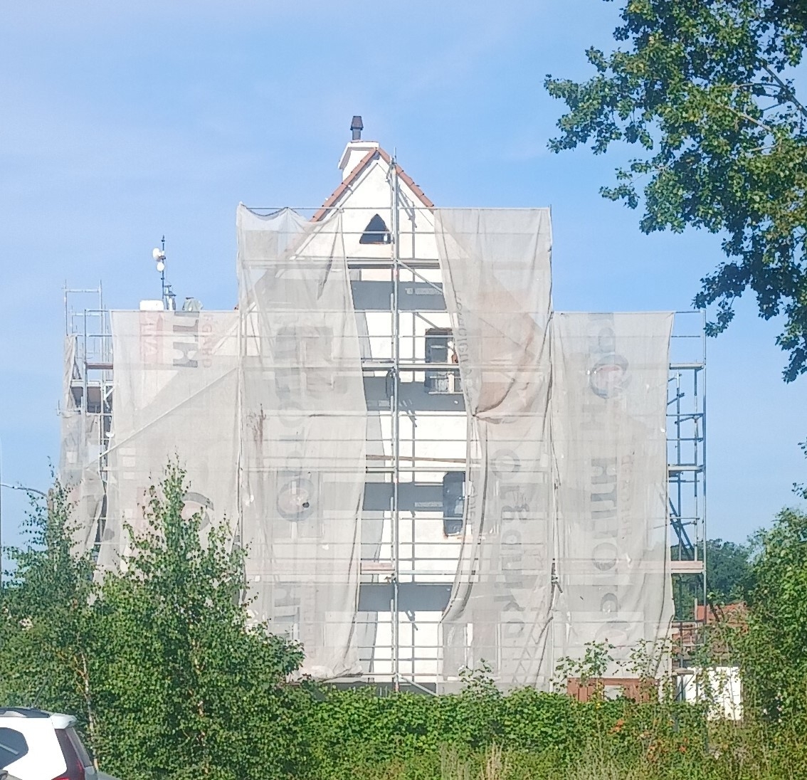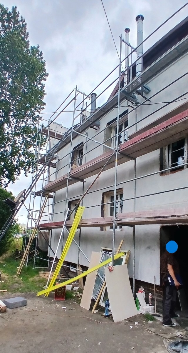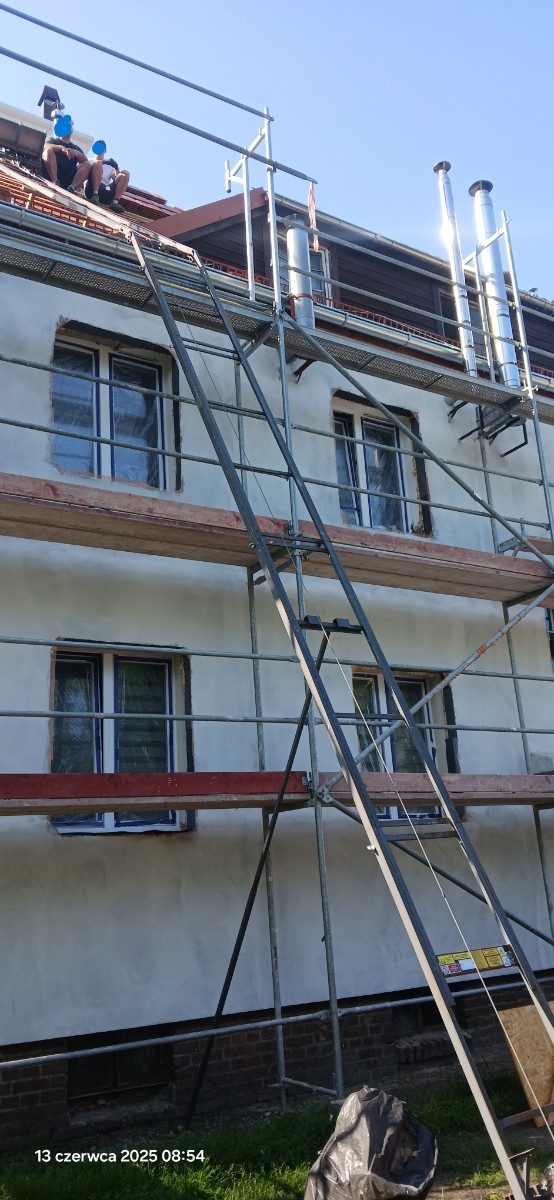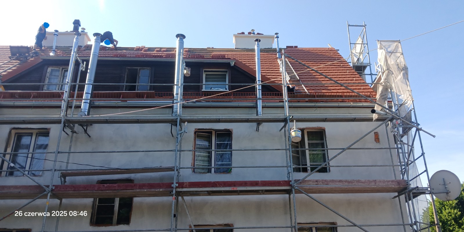 Obecnie zrealizowano zagruntowanie ścian zewnętrznych oraz przygotowanie pod wykonanie wypraw tynkarskich.