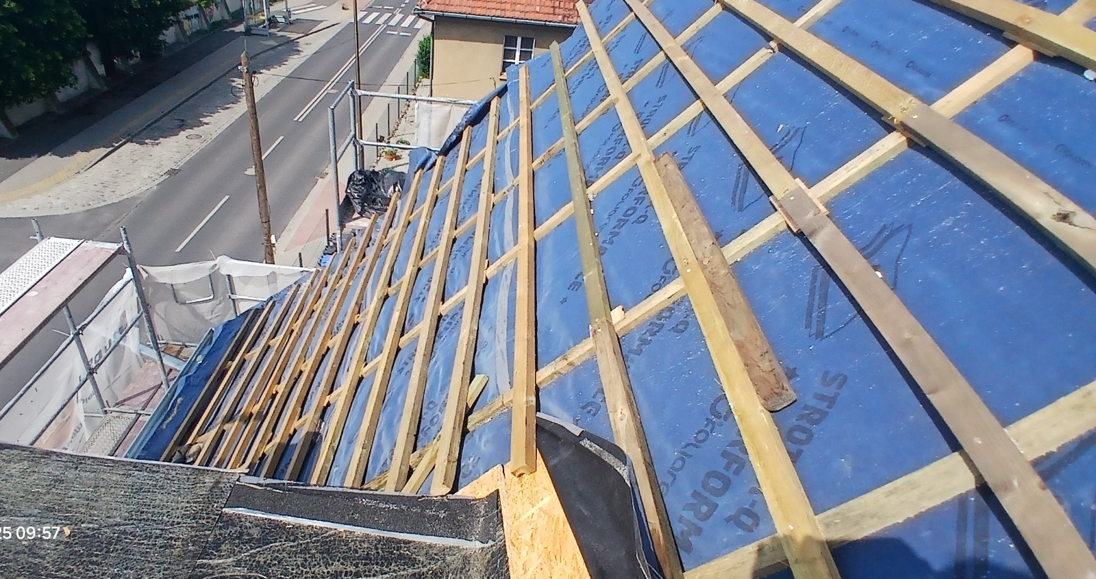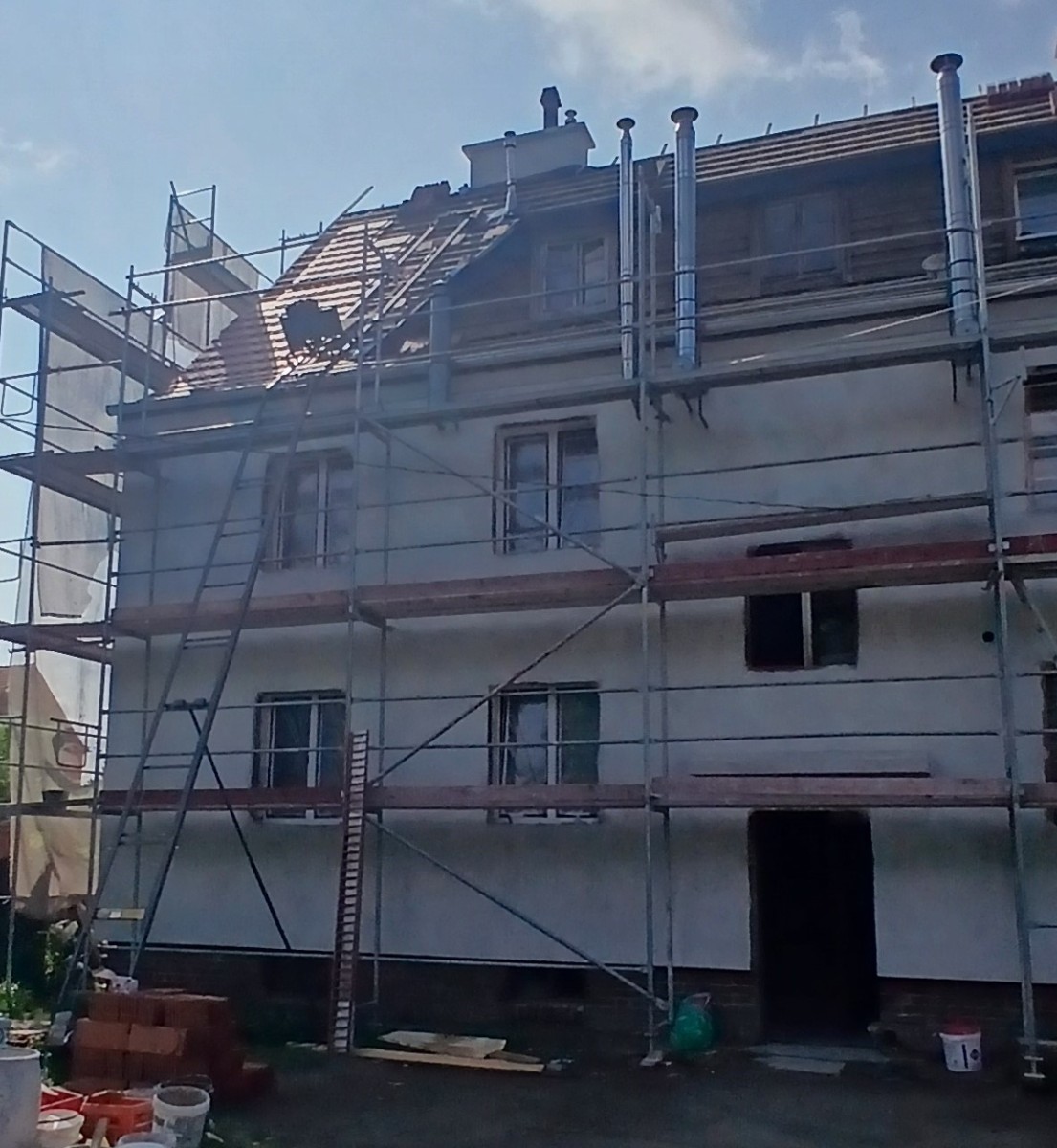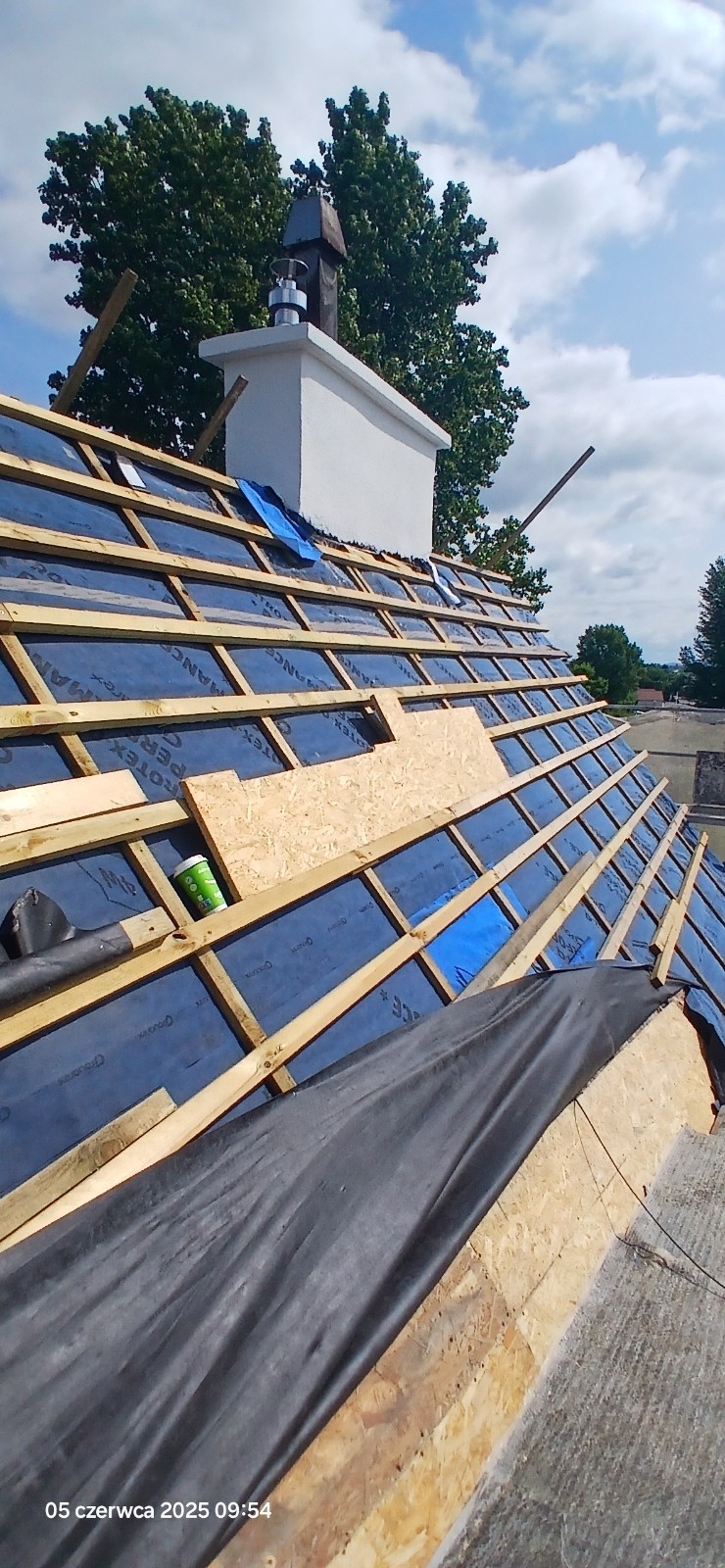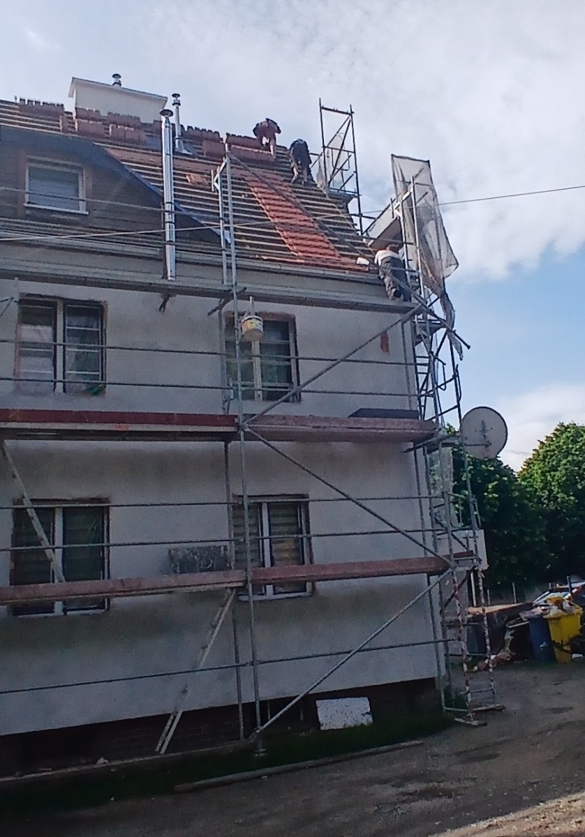 Ponadto rozebrano stare pokrycie z dachówki, wykonano izolację wełną mineralną, wymieniono łaty wraz z membraną dachową.
